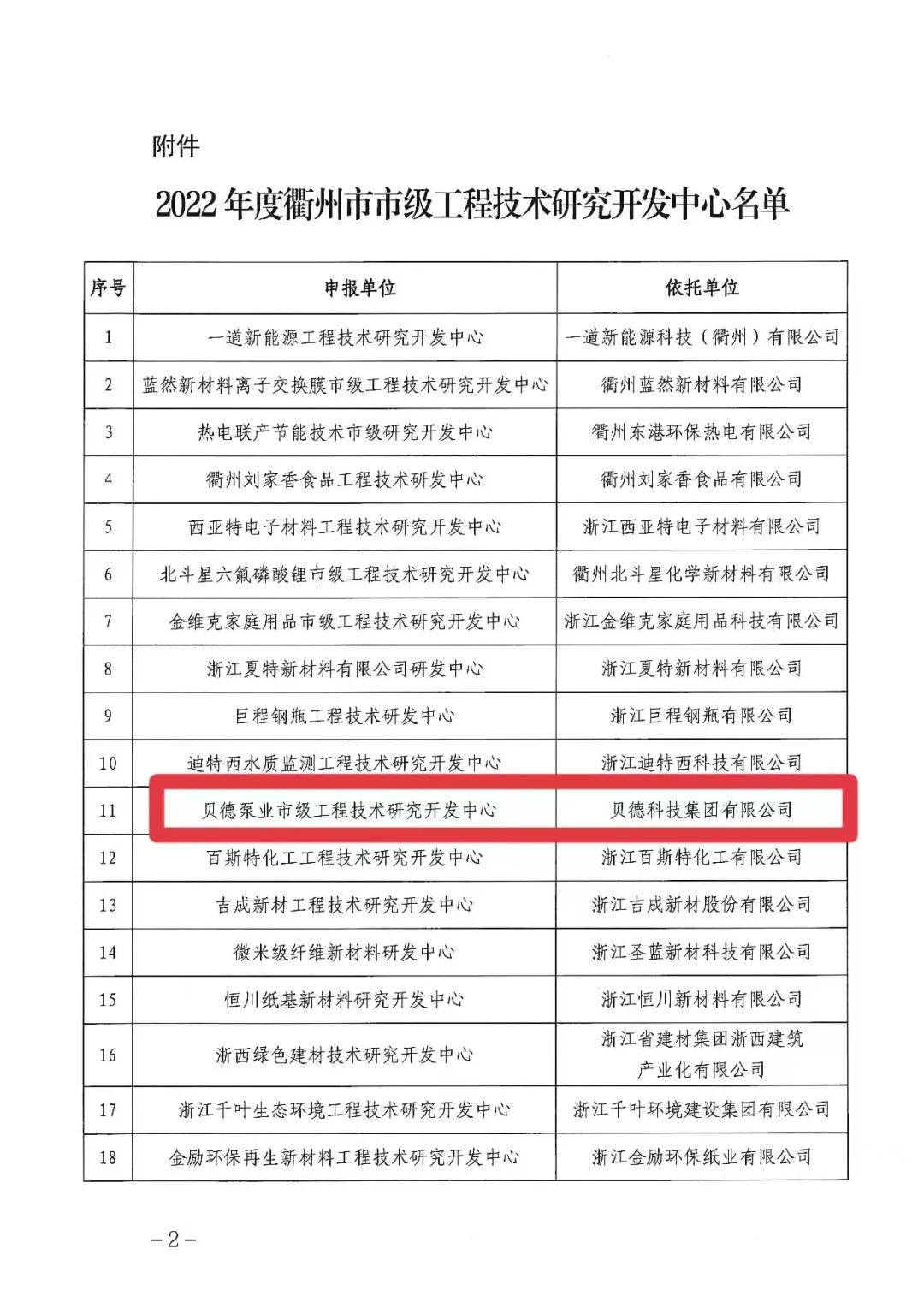 榜上有名丨貝德泵業市級工程技術研究開發中心進入衢州市市級工程技術研究開發中心名單